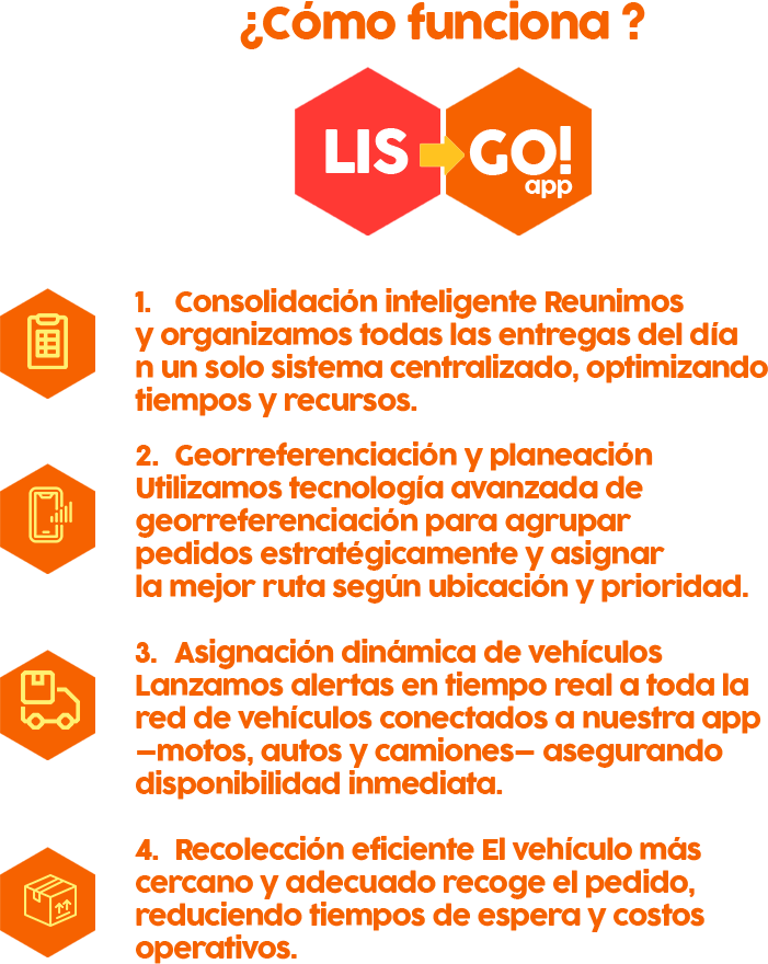 LIS GO transforma la logística de última milla. Conectamos empresas con sus clientes finales usando toda la red de vehículos de la ciudad —autos, motos, camiones— para lograr entregas más rápidas, económicas y confiables. Un modelo B2B escalable, diseñado para optimizar costos y elevar la experiencia del cliente. LIS GO: más velocidad, más control, más clientes satisfechos.